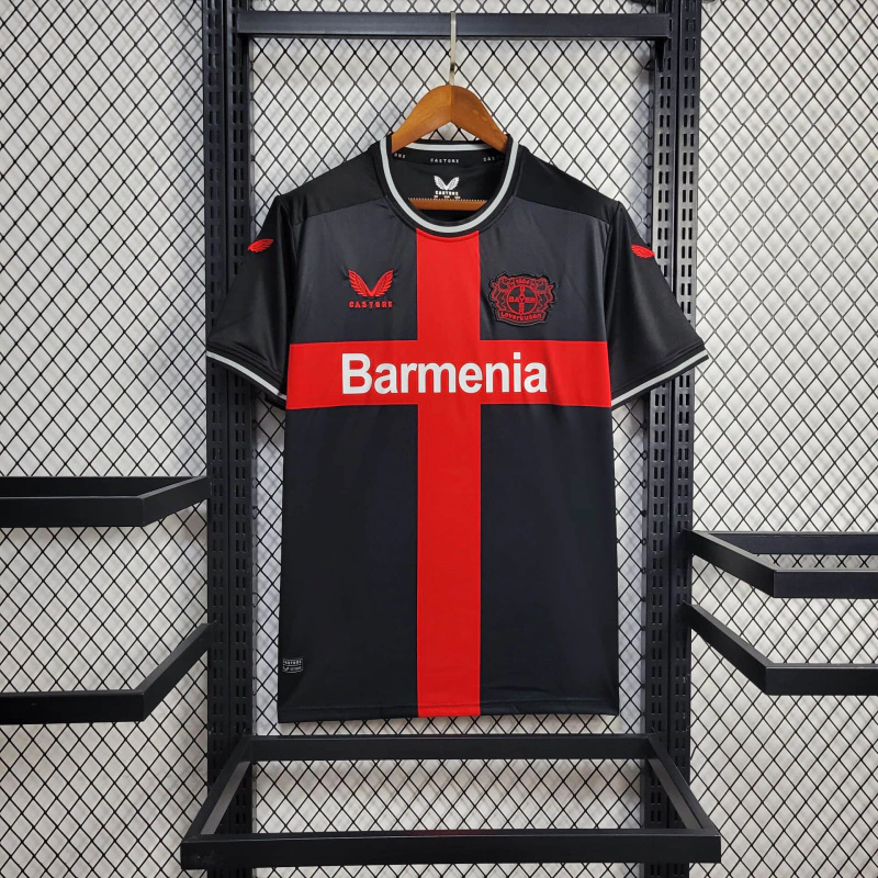 O escudo do Bayer está no lado esquerdo do peito, numa versão preta e vermelha, enquanto o logo da Castore aparece no lado direito e nos ombros em vermelho. O patrocínio máster da Barmenia é aplicado em branco, dentro da cruz.