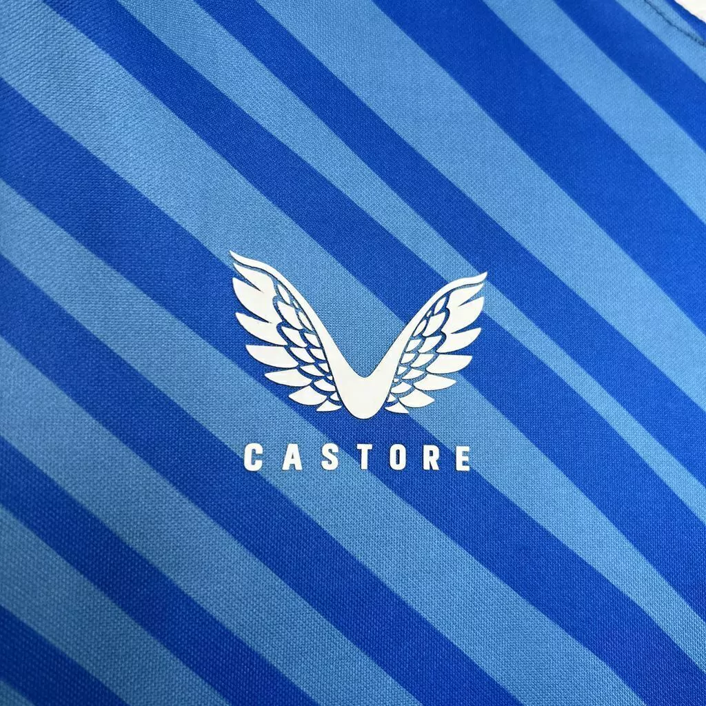 A gola é V com detalhe frontal branco, cor que é vista também no logo da Castore e no patrocínio master. O escudo é visto no lado esquerdo do peito.