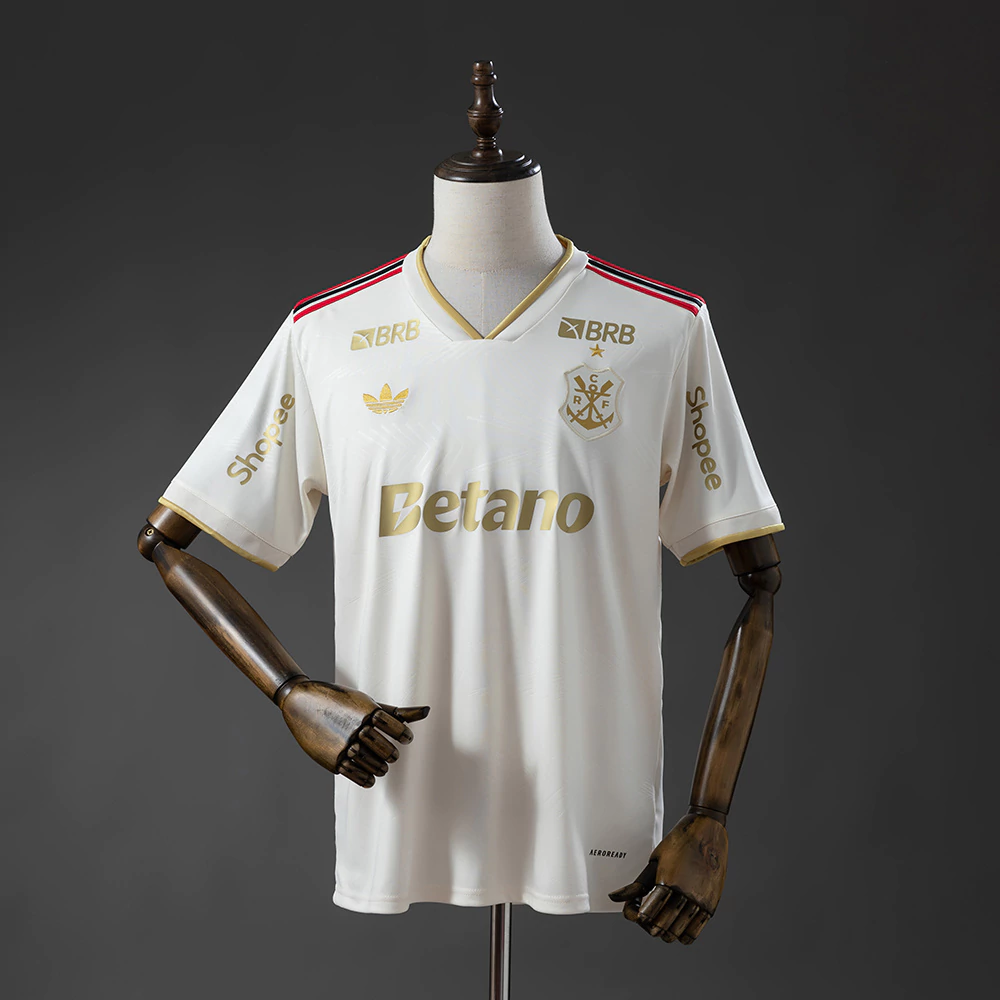 A nova Camisa Flamengo III 2025/26, criada pela adidas, é mais do que um manto — é um retorno às origens do Mengão. Inspirada na fundação do clube, o design traz o off-white clássico como cor predominante, representando a pureza e o início da história rubro-negra, enquanto os detalhes dourados exaltam a grandeza e as conquistas eternas do Flamengo.