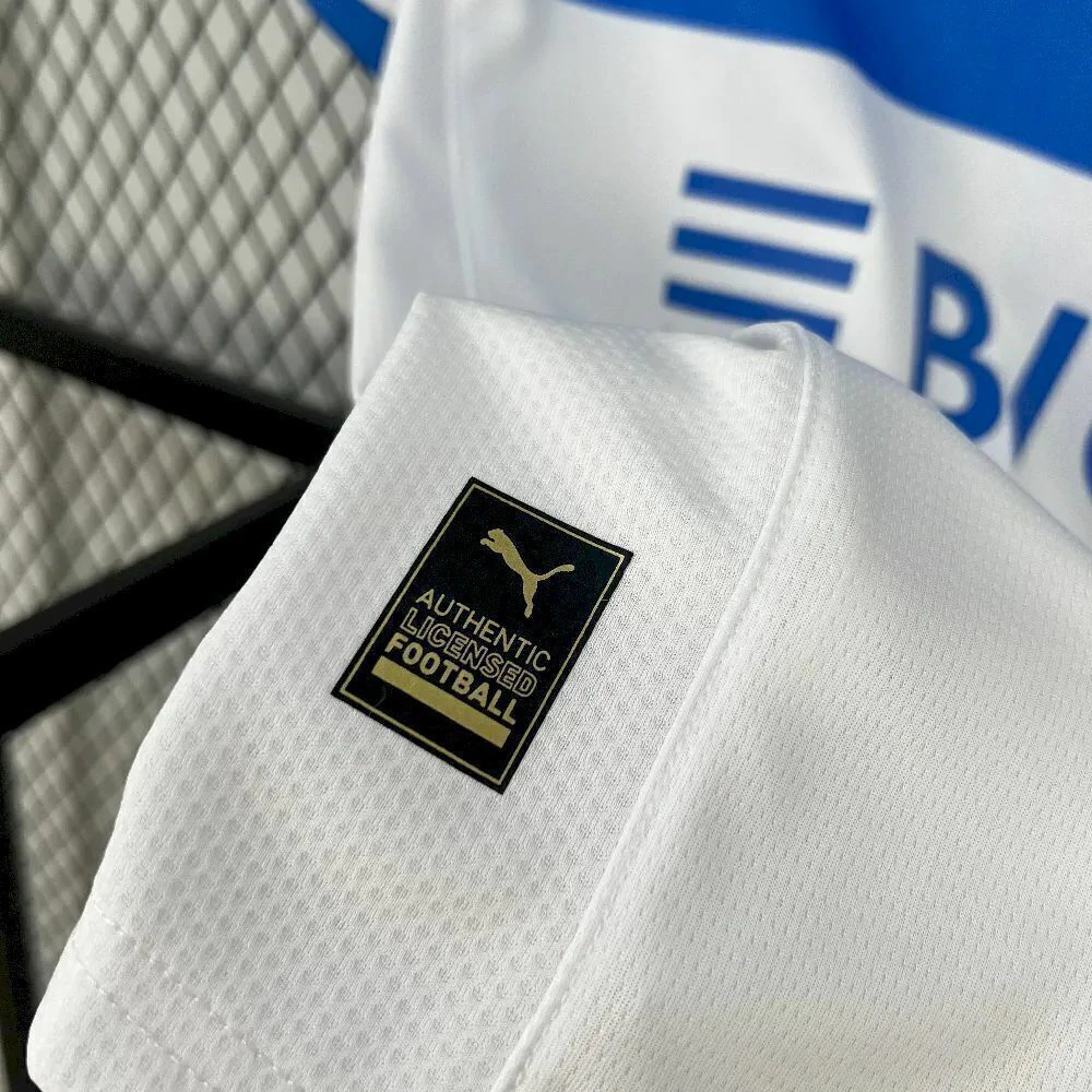 O escudo é aplicado dentro da faixa, no lado esquerdo do peito, enquanto o logo da PUMA aparece em branco, no lado direito, e em azul nas mangas, cor que também é vista nos patrocinadores frontais e de mangas.