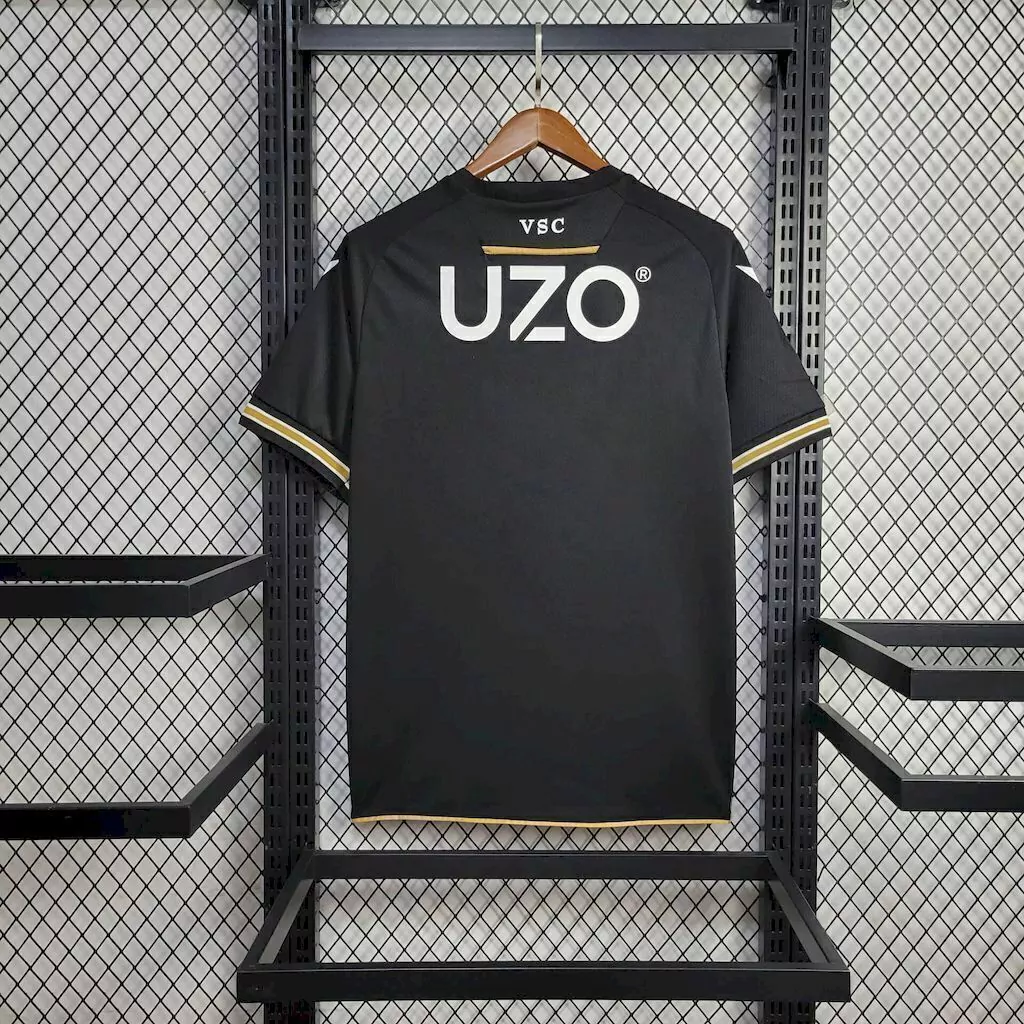 A nova camisa reserva é preta e traz o mesmo padrão em jacquard. A gola é V com frisos em branco e dourado na parte frontal. Os punhos são pretos e traz um friso dourado com bordas brancas.