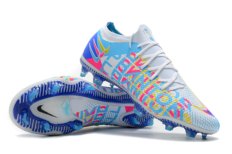 Uma sobreposição repetida com as palavras "Phantom", "Skills" e "Nike Football" cria um look com inspiração em 3D.