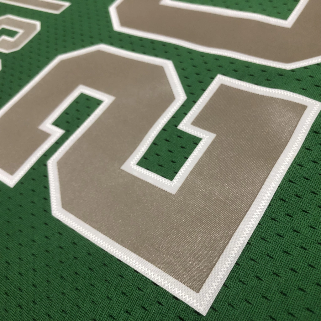 O símbolo da NBA é feito em silk, um pouco diferente do tipo utilizado nos demais detalhes da camisa;