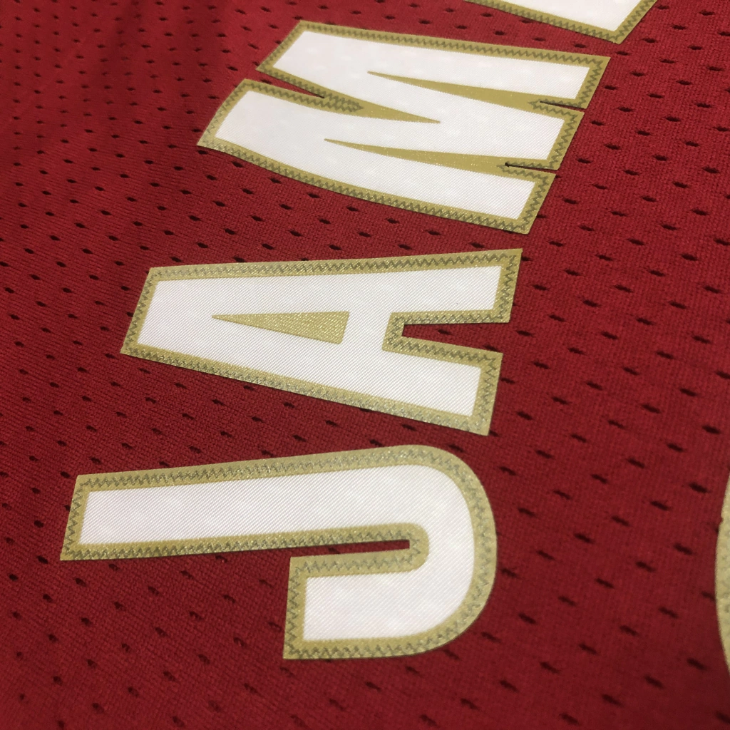 O símbolo da NBA é feito em silk, um pouco diferente do tipo utilizado nos demais detalhes da camisa;