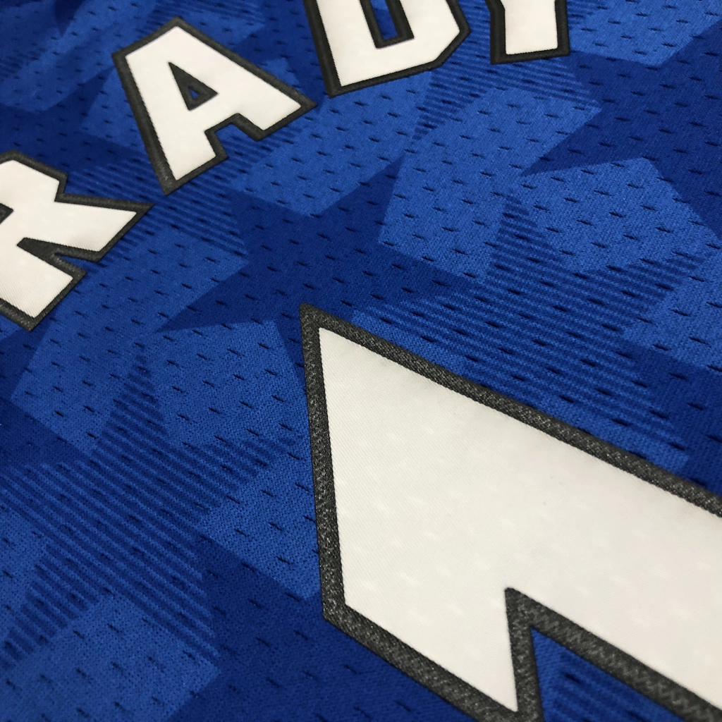O nome do time ou logo e o número da parte da frente da camisa também são feitos em silk;