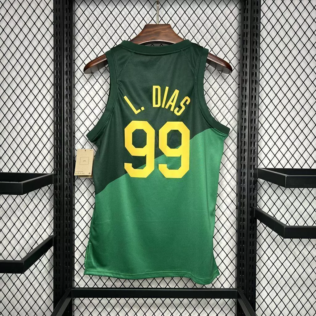 O símbolo da NBA é feito em silk, um pouco diferente do tipo utilizado nos demais detalhes da camisa;
