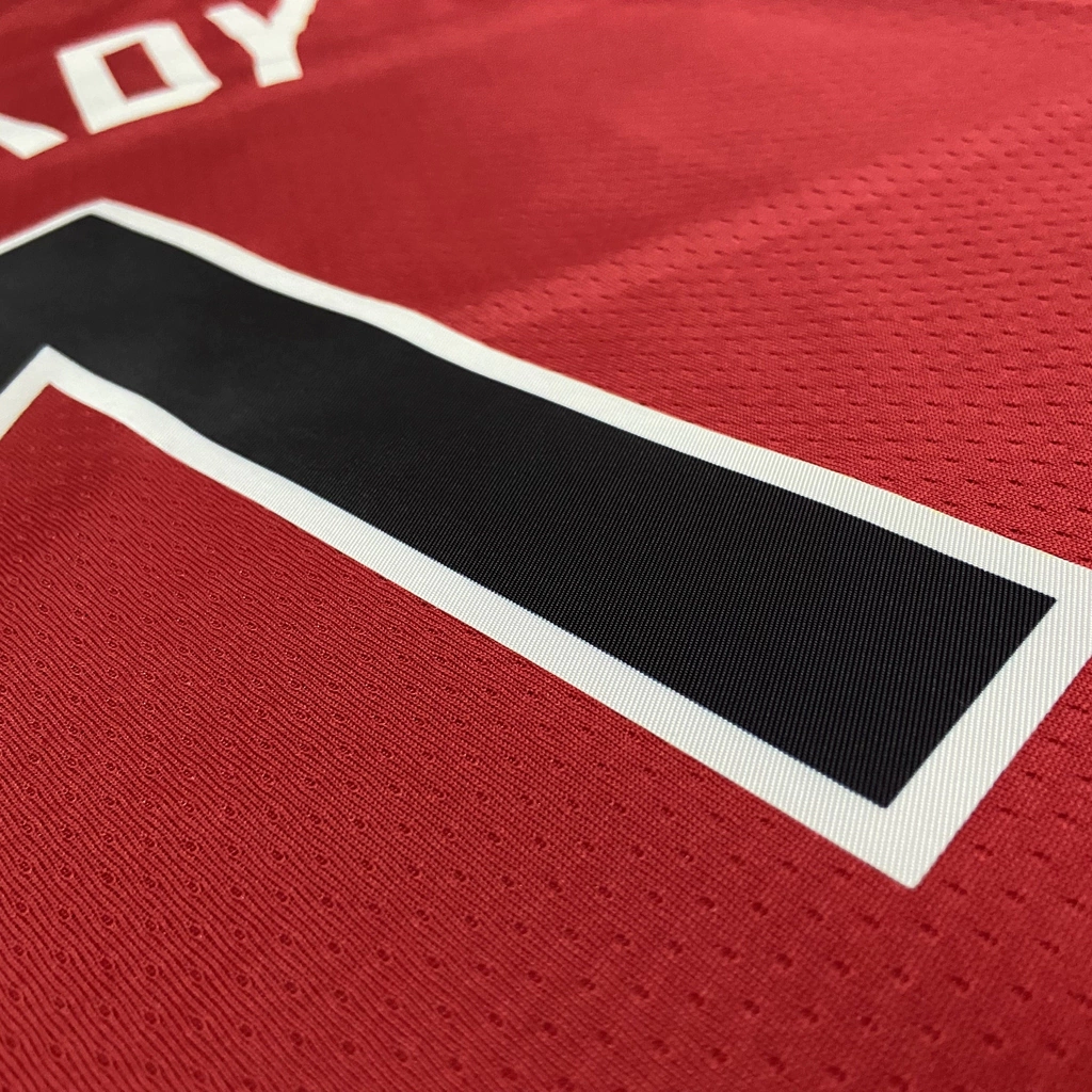 O nome do time ou logo e o número da parte da frente da camisa também são feitos em silk;